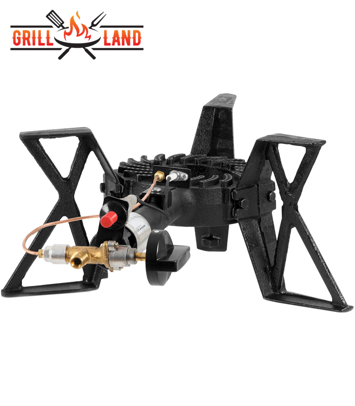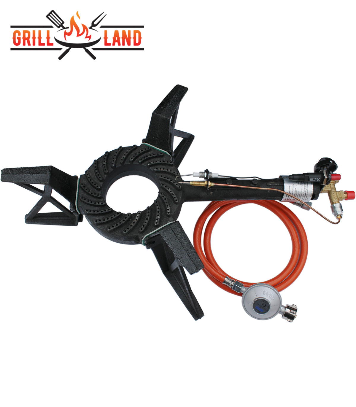 Профессиональная чугунная газовая горелка, мощностью 10,5 кВт на трех ножках, диаметром 18 см, контролем пламени и пьезоэлектрическим поджигом, в комплекте со шлангом и регулятором.